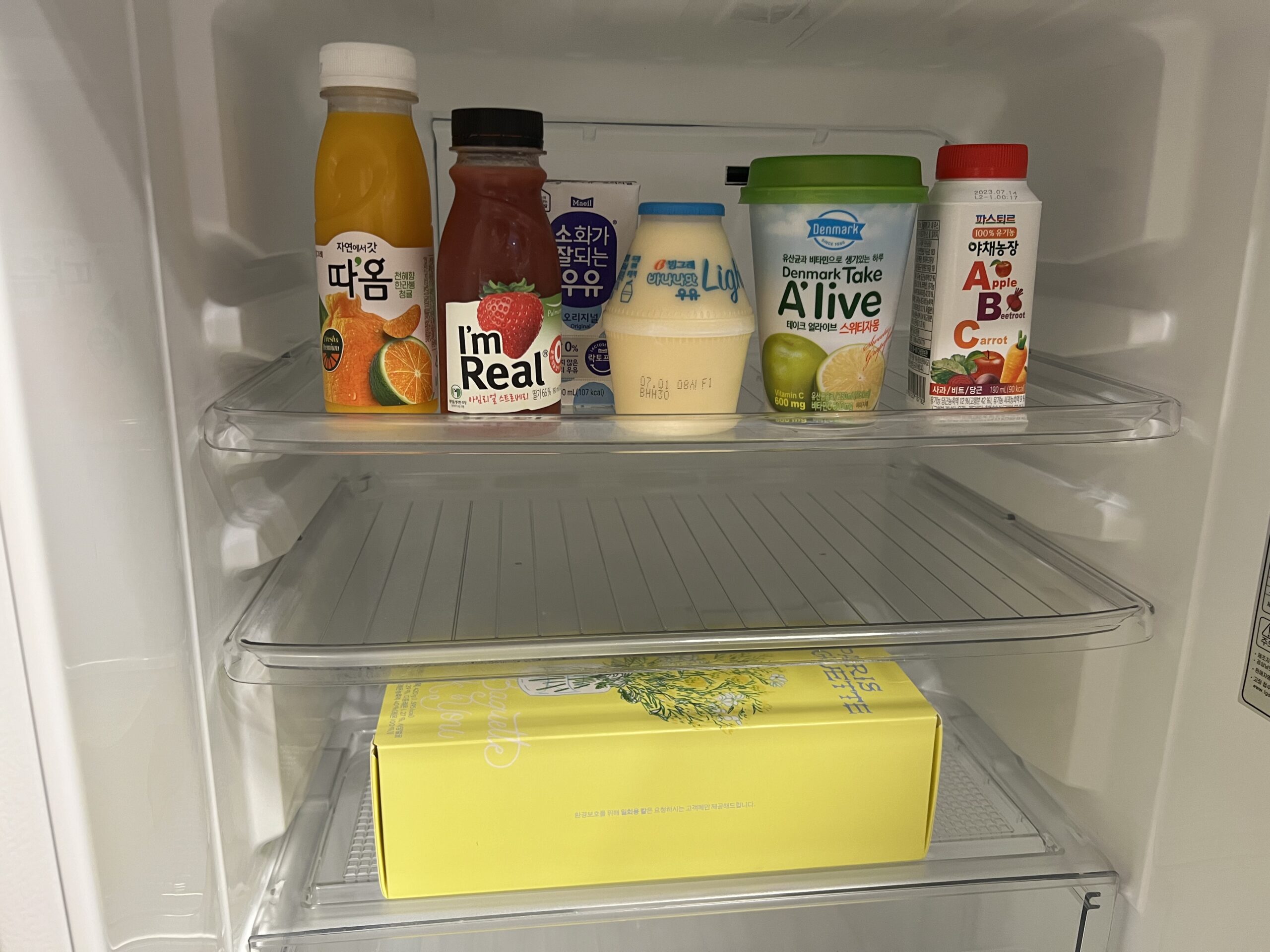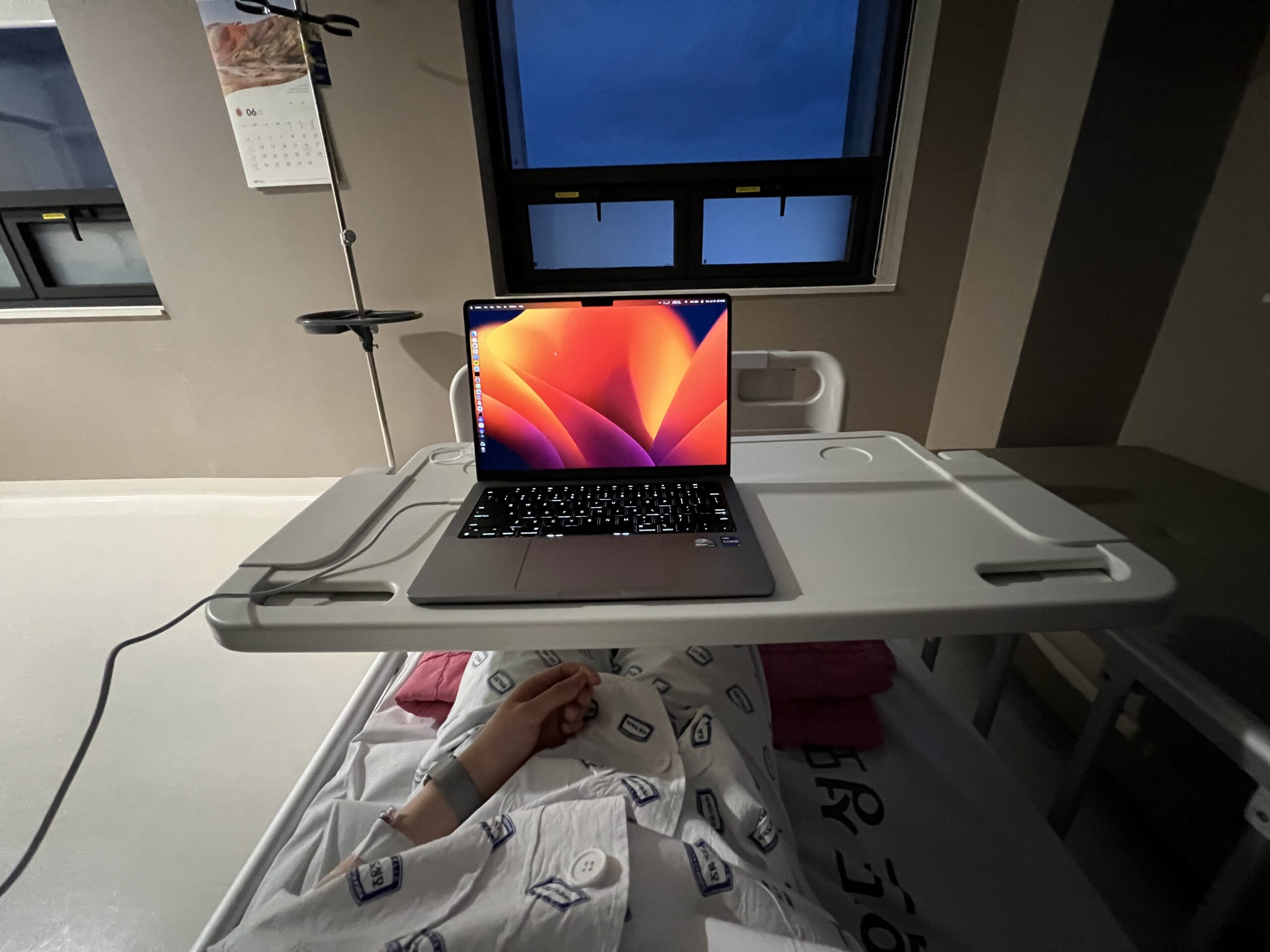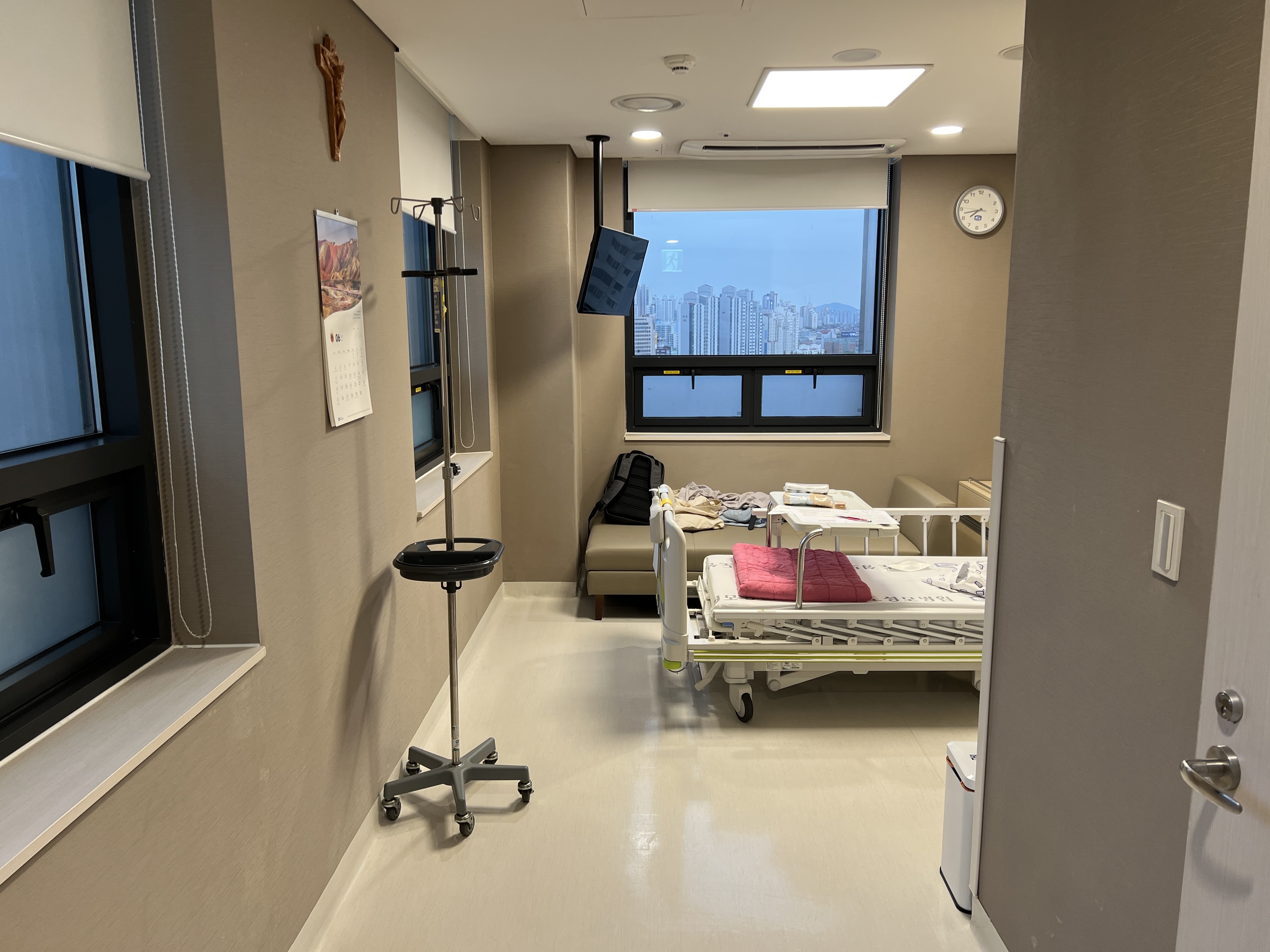 입원실은 여의도성모병원 13층의 1인실을 배정받았는데, 노량진수산시장과 올림픽대로, 그리고 노들로가 한 눈에 들어오는 뷰가 인상적이었다. 환자용 침대는 모든 것이 일체형이다 보니 누워서 노트북을 포함해 모든 작업을 할 수 있는 게 좋았다. 병실에는 TV가 있었지만 HDMI 케이블이 없어 아쉽게도 노트북에 연결해서 사용하지는 못했고, 지상파 방송만 볼 수 있었다. 냉장고를 열어보니 코디네이터님이 준비해 주신 레몬 케이크와 우유, 그리고 주스 몇 병이 있었다. 간식은 코디네이터님께서 적당히 골라서 채워주신다던데, 미리 선호하는 간식을 말씀드려야 했나 싶다. 케이크는 양이 꽤나 많았는데 너무 달아 얼마 먹지는 못했고, 다음 날 편의점에서 간식거리를 따로 사 왔다.