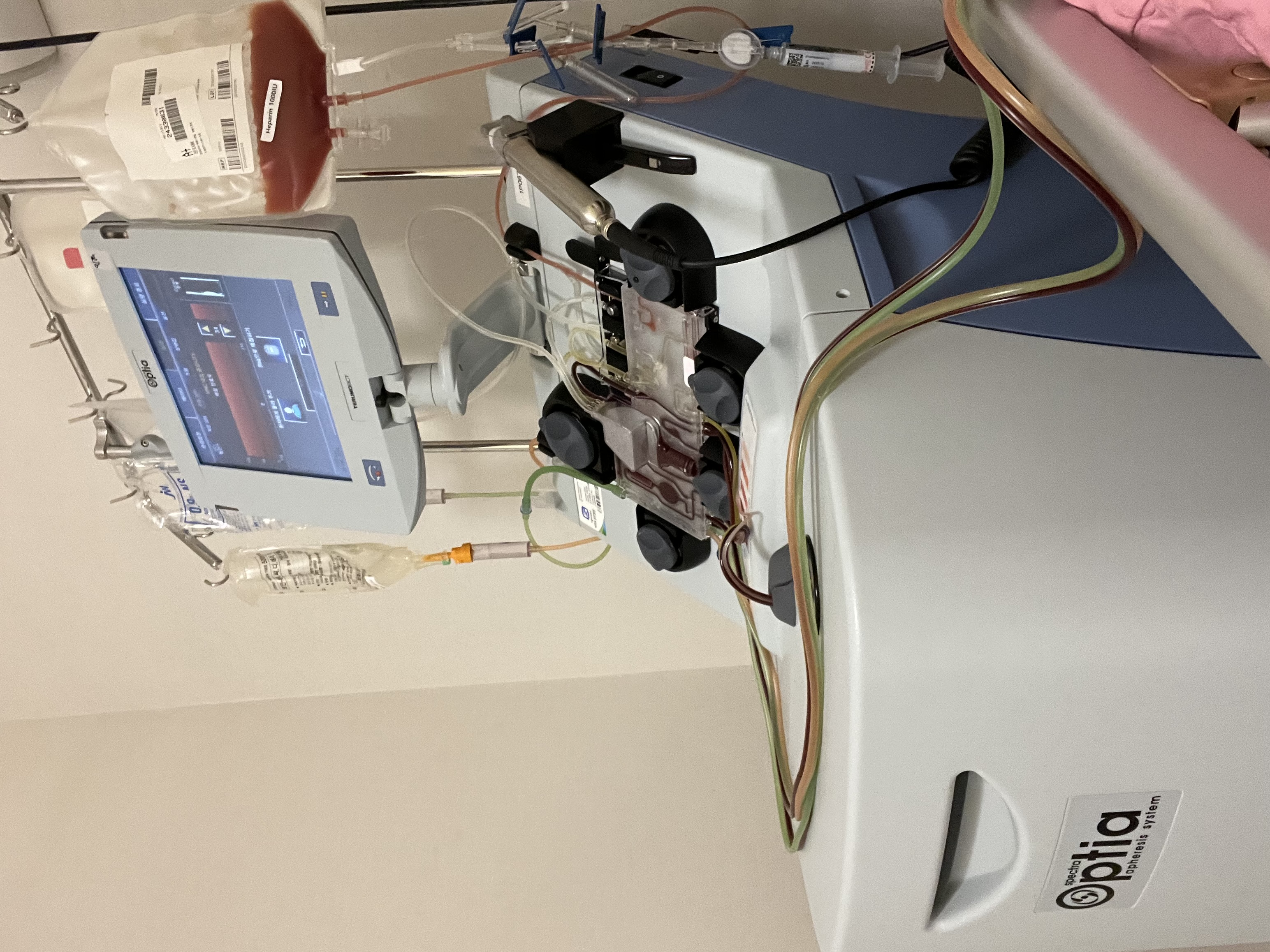 삽관 이후 순서는 조혈모세포 채집. 먼저 병실로 다시 올라가서 폰과 노트북 등 전자기기를 챙겼다. 채집에 걸리는 몇 시간을 전자기기 없이 보낼 순 없었기 때문이다. 이후 휠체어를 타고(걸을 수 있는데…) 옆에 노트북과 폰을 낀 채 헌혈실까지 이동했다. 헌혈실 한쪽 끝에 나를 위한 침대와 장비가 준비되어 있었다. 채집에 사용한 장비는 Terumo BCT사의 최상급 모델인 Spectra Optia로, UI가 완전 한국어로 되어 있어서 꽤나 흥미로웠다. 과연 이렇게 번역해서 얼마나 팔까, 한국에서 파는 대수 자체가 매우 적을 텐데도 전체 UI가 번역되어 있는 것이 신기할 뿐이었다.