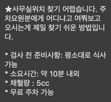 전체 항원형 검사를 위해 서울성모병원에 위치한 가톨릭조혈모세포은행 사무실을 찾았다. 가톨릭조혈모세포은행 사무실은 찾기 매우 어렵다. 그 큰 성모병원에서도 사무실들만 모여 있고 환자는 오가지 않는 곳 중간에, 의대가 위치한 건물에 함께 있다. 당연히 안내판 따위는 없다. 그렇다 보니 사무실을 찾아가는 데 꽤나 고생을 했다. 코로나 때문에 주 출입구 외에는 출입이 불가능했기에 본관으로 들어가서 내부에서 이동해야 했는데, 오죽하면 담당 코디네이터조차도 사무실 위치를 찾기가 어려우니 주차요원분께 여쭤보라고 했을 정도다. 하지만 문제는 주차요원도 조혈모세포 은행의 위치를 모른다는 데에 있었다. 하긴 병원을 찾는 수많은 사람 중 조혈모세포은행을 찾는 사람이 과연 얼마나 있을까 싶긴 하다. 건물에 들어서고도 15분쯤은 헤매다가 우여곡절 끝에 사무실을 찾았던 것 같다. 일반적인 병원의 분위기가 전혀 아닌 그냥 평범한 회사 사무실처럼 보이는 공간이 있었고, 한 켠에 마련된 테이블에서 바늘과 채혈관(vacutainer)을 가져와 채혈을 했다. 채혈 며칠 후 나온 항원형 상세 검사 결과는 아쉽게도 불일치였고, 결국 기증은 성사되지 않았다.